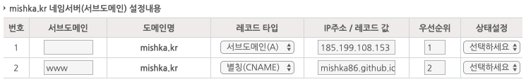 Home > 도메인 > 부가서비스 > 네임서버 설정 관리 들어가서 github에서 요구 하는데로 변경을 시켜줍니다.