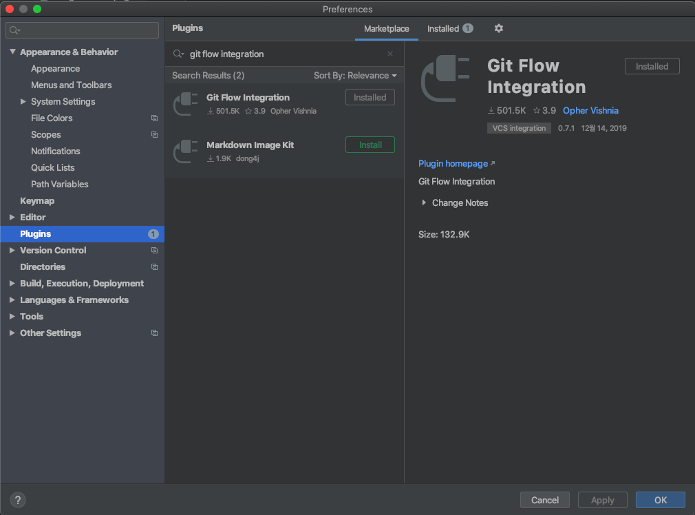 gitflow 를 설치하고 나면 preferences > plugins > marketplace 에서 Git Flow Integration 를 검색하여 설치해 줍니다.