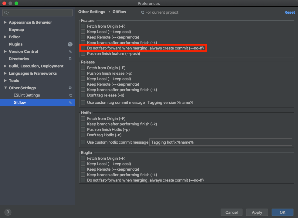 gitflow 에서 Do not fast-forward when merging, always create commit(--no-ff) 옵션에 체크 하시면됩니다.
