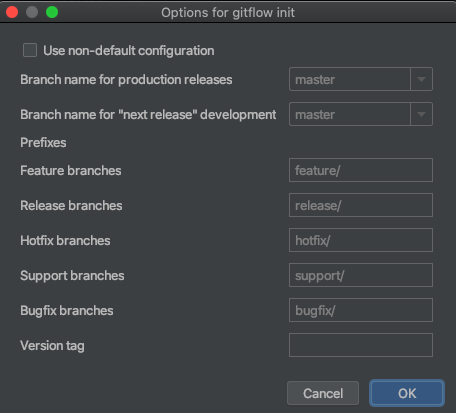 No Gitflow 를 클릭하셔셔 init Repo 를 선택하면 아래와 같은 설정화면이 나옵니다.