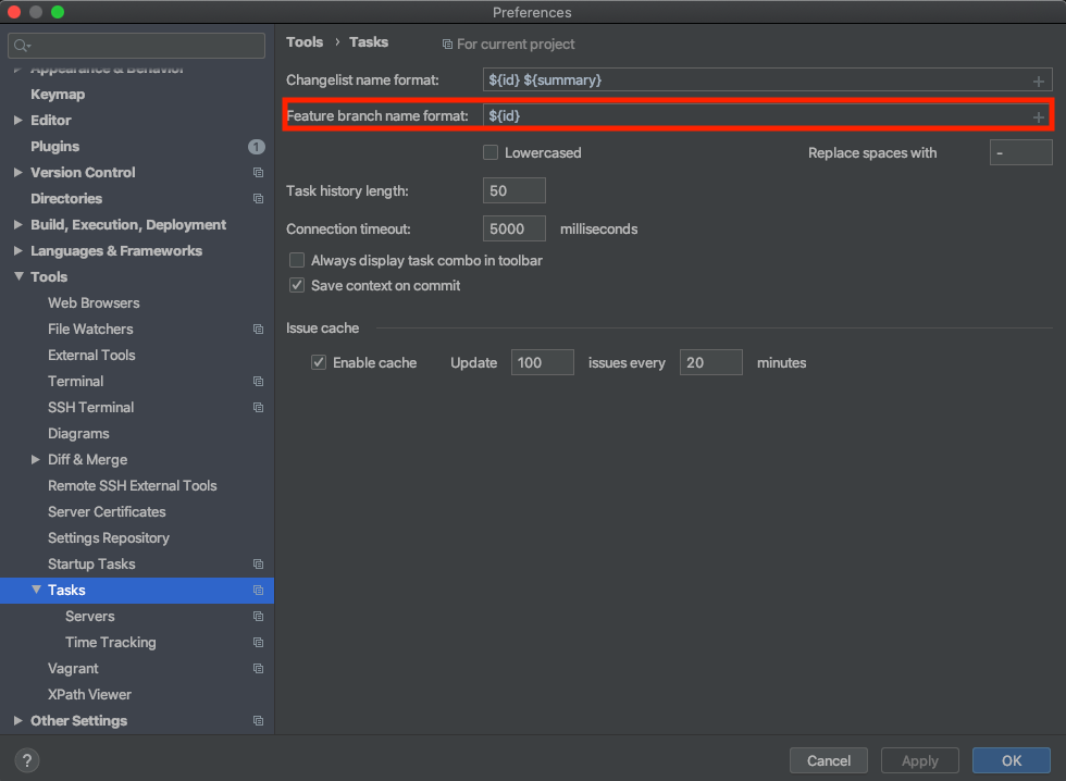 기본적으로 Task에서 생성해주는 브랜치 명은 티켓ID 로 자동할당됩니다. 생성 템플릿을 변경하려면Preferences > Tasks에서 Feature branch name format을 원하는 규칙으로 수정하면됩니다.