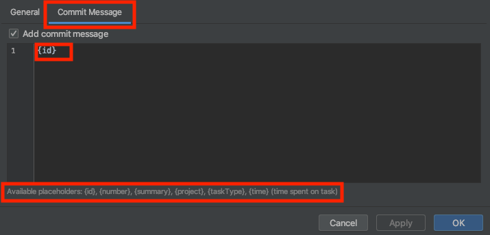 커밋 메세지는 자동생성되는데 기본 옵션으로 티켓ID + 제목 으로 되어있고 설정을 변경할 수 있습니다.Preferences > Tasks > Servers Commit Message 탭을 클릭해서 원하는 규칙으로 수정 할 수 있습니다.