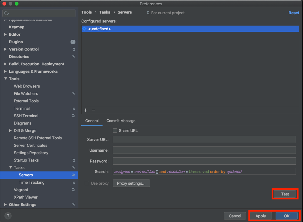 webstorm에서 preferences > Tasks > Servers 로 이동합니다. 화면에서 + 버튼을 클릭해서 JIRA를 선택합니다.