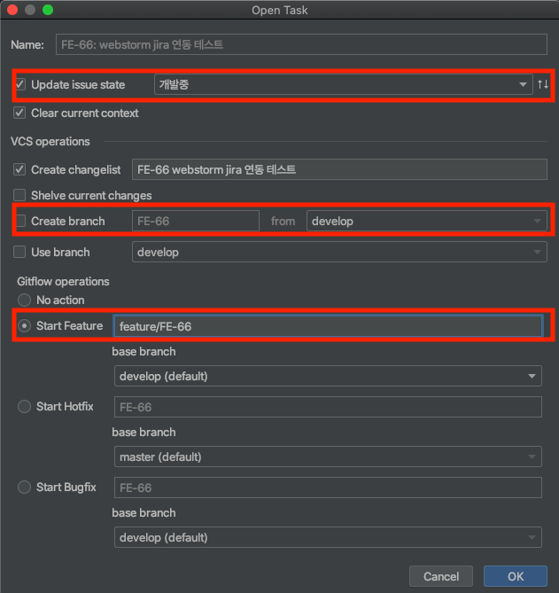 테스트를 위해 티켓을 별도로 하나 생성했습니다. FE-66 티켓을 선택해 주면 아래와 같은 창이 열립니다.