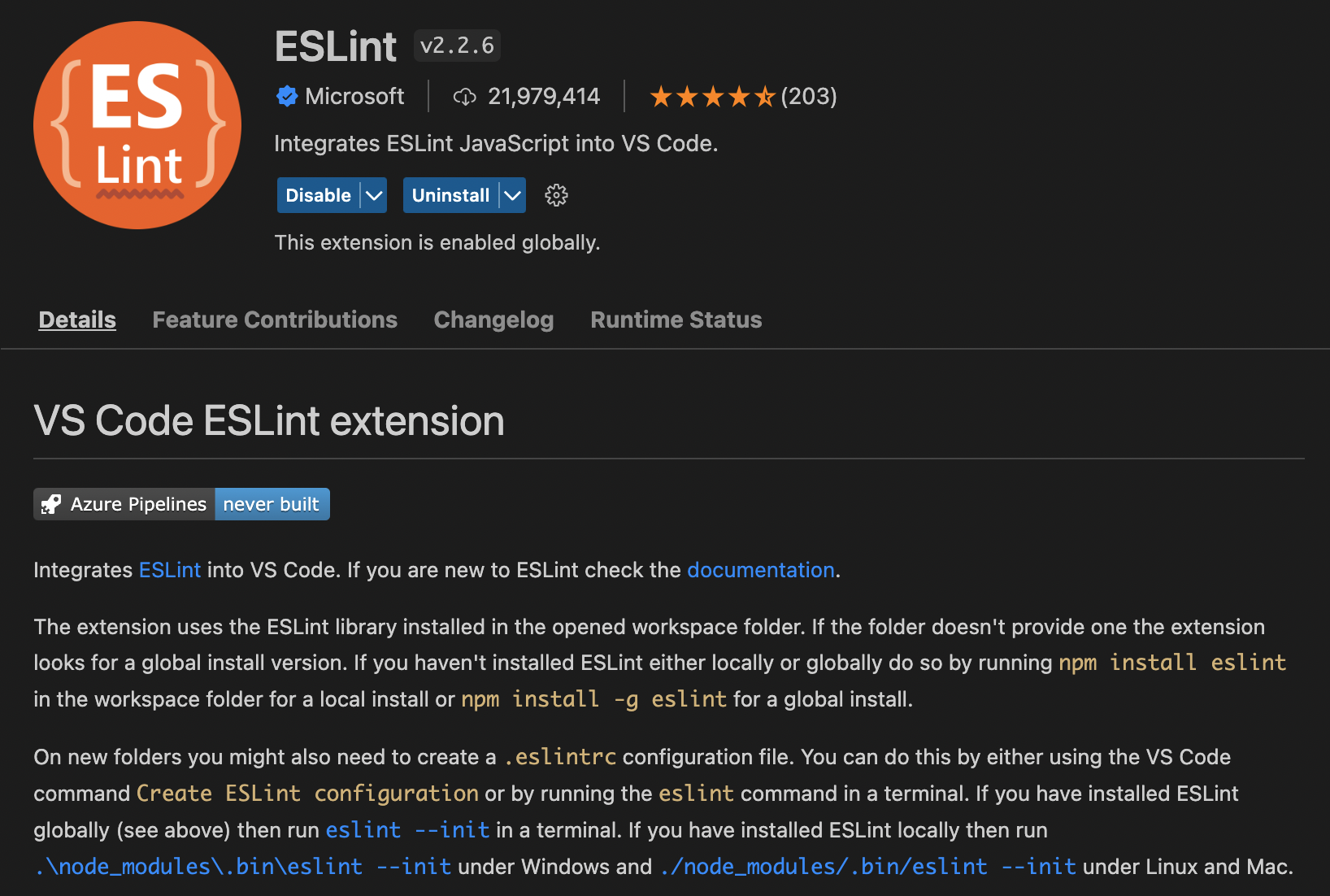 ESLint 를 사용하려면 ESLint Library만 설치하거나 ESLint extension만 설치 하는 것이 아니라 둘다 설치 및 세팅이 되어 있어야 한다.
